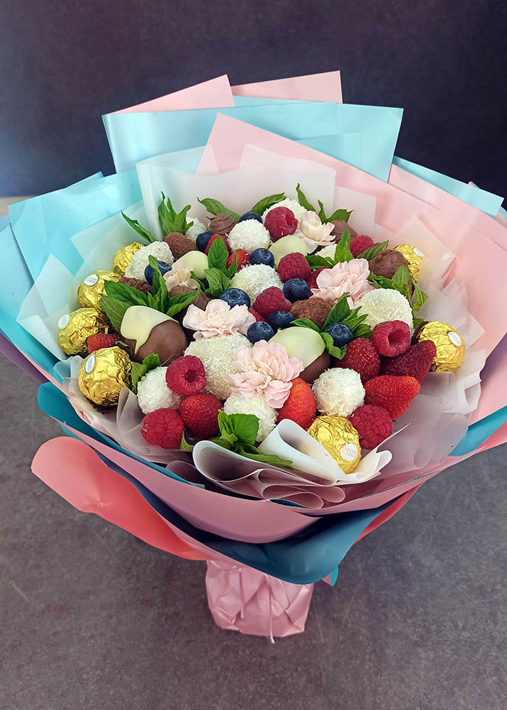 Они могут быть фруктовые, сладкие, мясные, рыбные, ореховые или комбинированные. Каждый букет создаётся как произведение искусства: красиво, стильно и при этом вкусно.