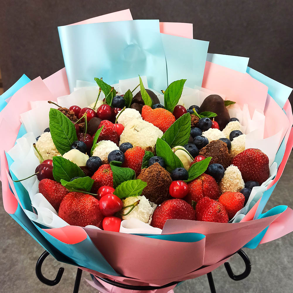 Они могут быть фруктовые, сладкие, мясные, рыбные, ореховые или комбинированные. Каждый букет создаётся как произведение искусства: красиво, стильно и при этом вкусно.