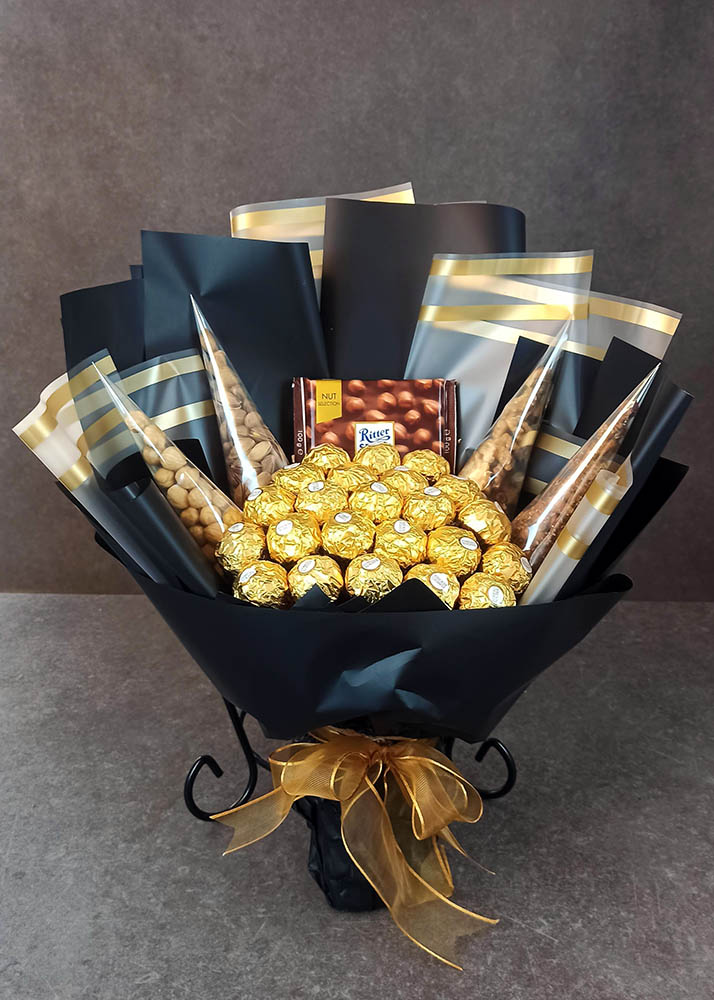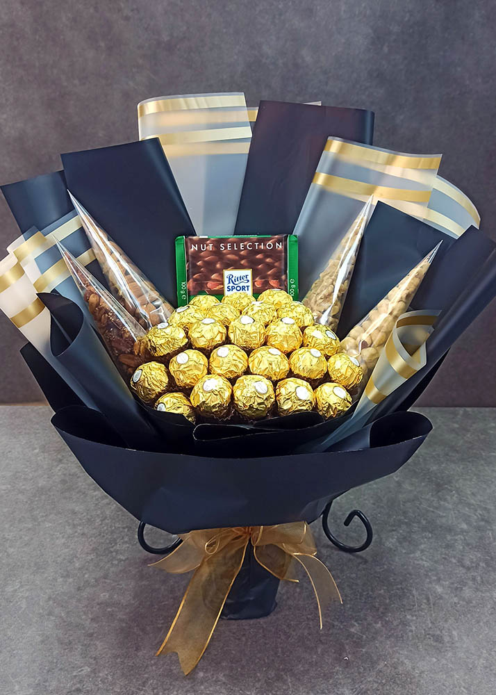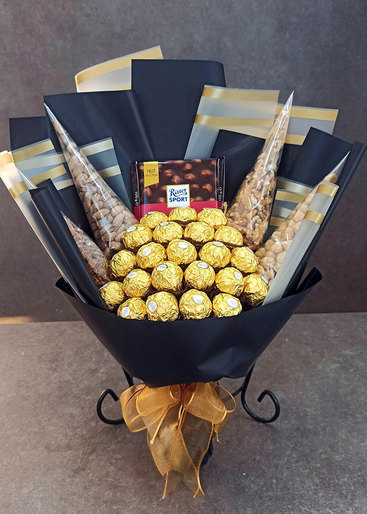 Они могут быть фруктовые, сладкие, мясные, рыбные, ореховые или комбинированные. Каждый букет создаётся как произведение искусства: красиво, стильно и при этом вкусно.