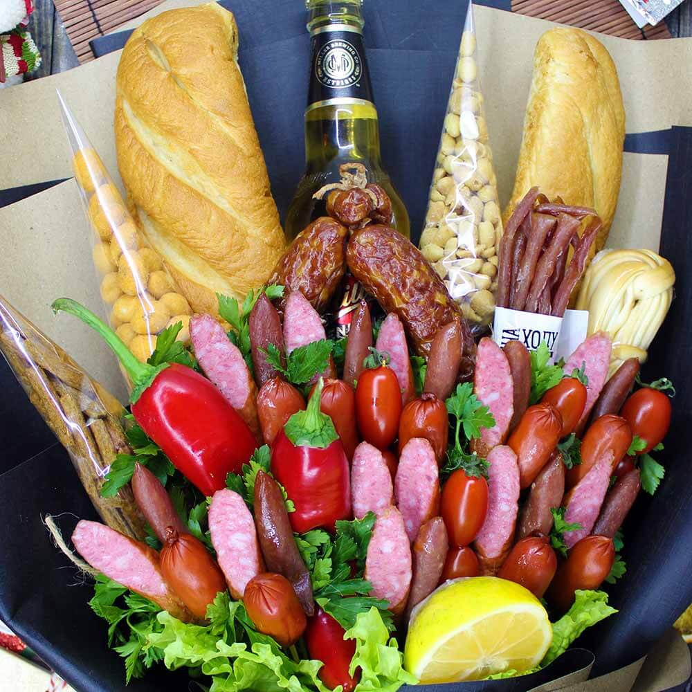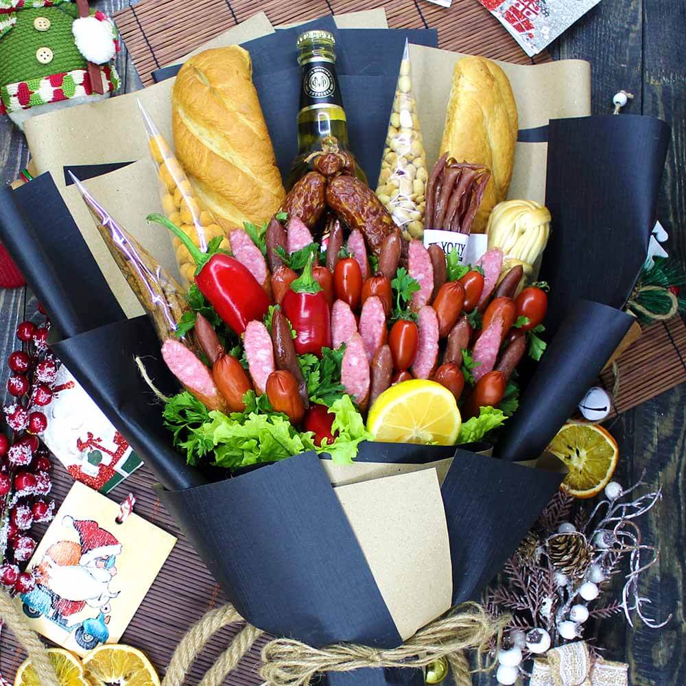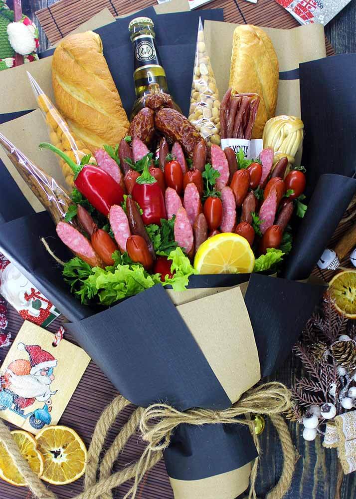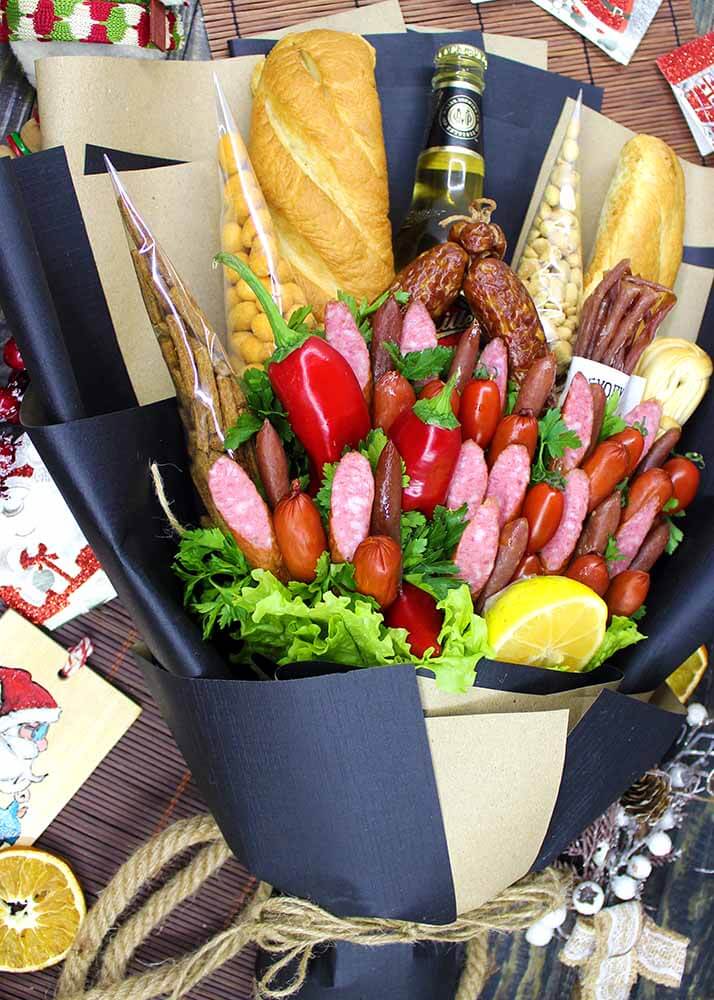 Они могут быть фруктовые, сладкие, мясные, рыбные, ореховые или комбинированные. Каждый букет создаётся как произведение искусства: красиво, стильно и при этом вкусно.